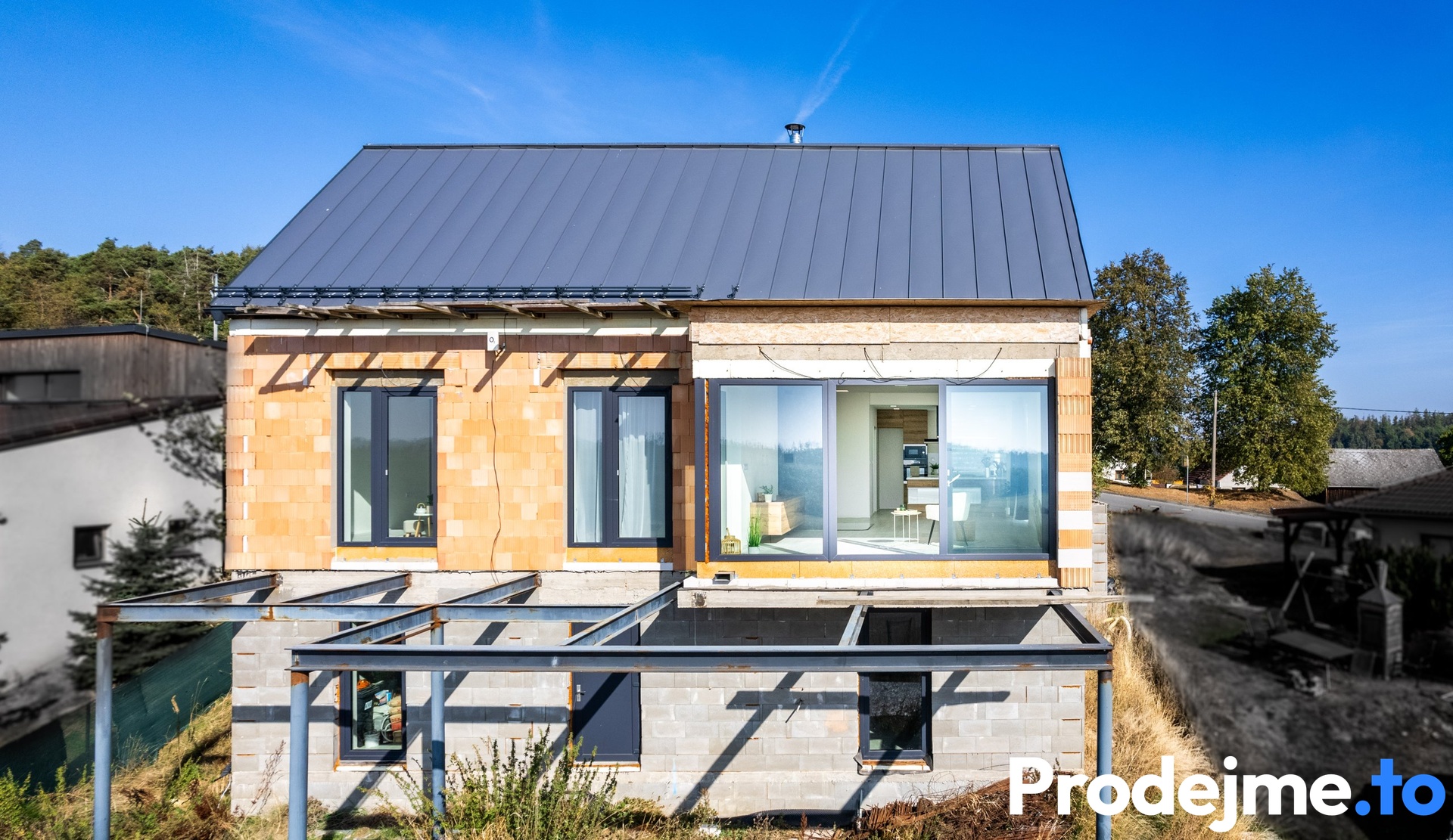 Dům leží na jižním svahu o ploše 822 m2 a má jedno podzemní a jedno nadzemní podlaží s podkrovím. Fasáda a okolí domu je k dokončení, ale nastěhovat se můžete ihned. Místnosti v podzemním i nadzemním podlaží jsou kompletně dokončené a je to opravdová fantazie!